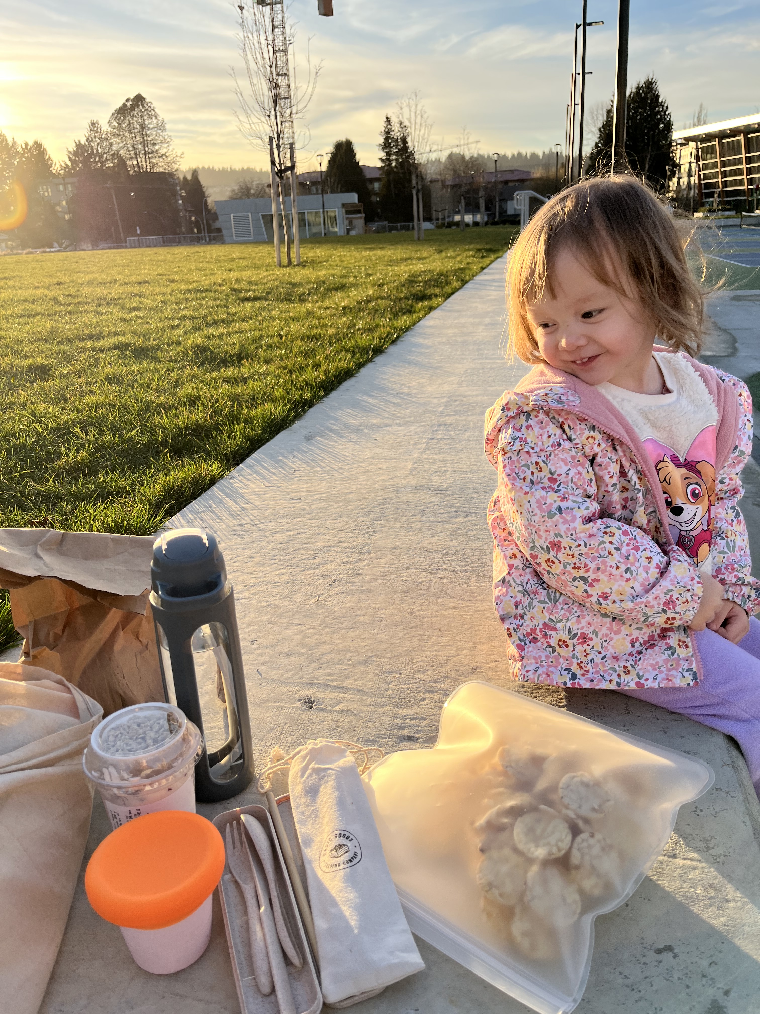 Carrying around reusable utensils makes it easy to pick up lunch to enjoy outside. I find disposable utensils flimsy and sometimes harmful to their sensitive skin. And because they’re reusable it’s never an option to leave them lying around.